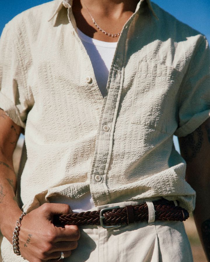 Our newest slightly oversized cotton button-up brings comfort and style together. Its unstructured collar and subtle windowpane pattern make it a great layering piece over a tank or classic tee.