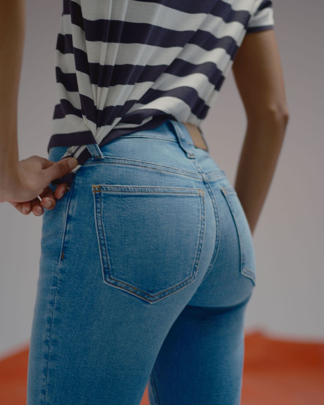A crop-on-crop moment courtesy of this striped crewneck and a modern mid-rise design.