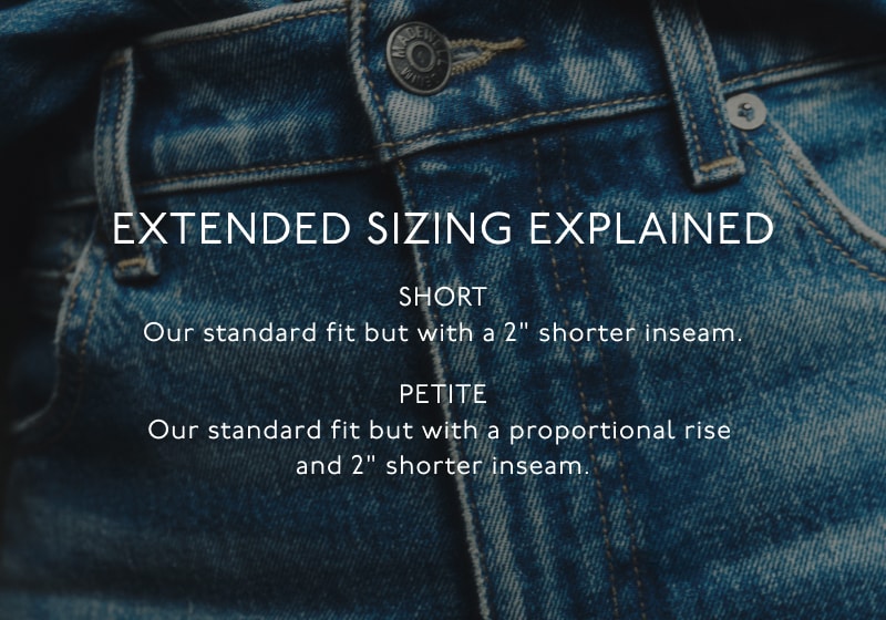 Our standard fit but with a proportional rise and 2” shorter inseam.