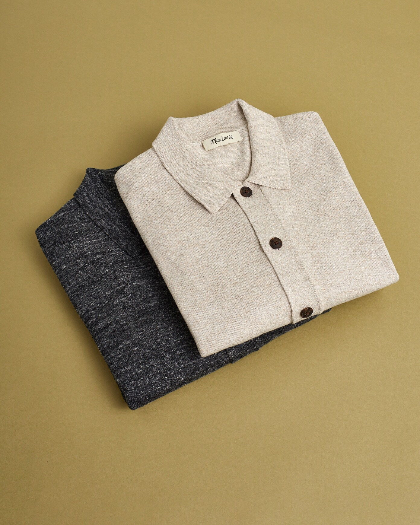Woven from a blend of cotton and recycled polyester, this midweight layer marries well-loved design aspects from sweaters, knit polos and cardigans alike. A spread collar and elevated heathered fabric make this a cool-weather essential.