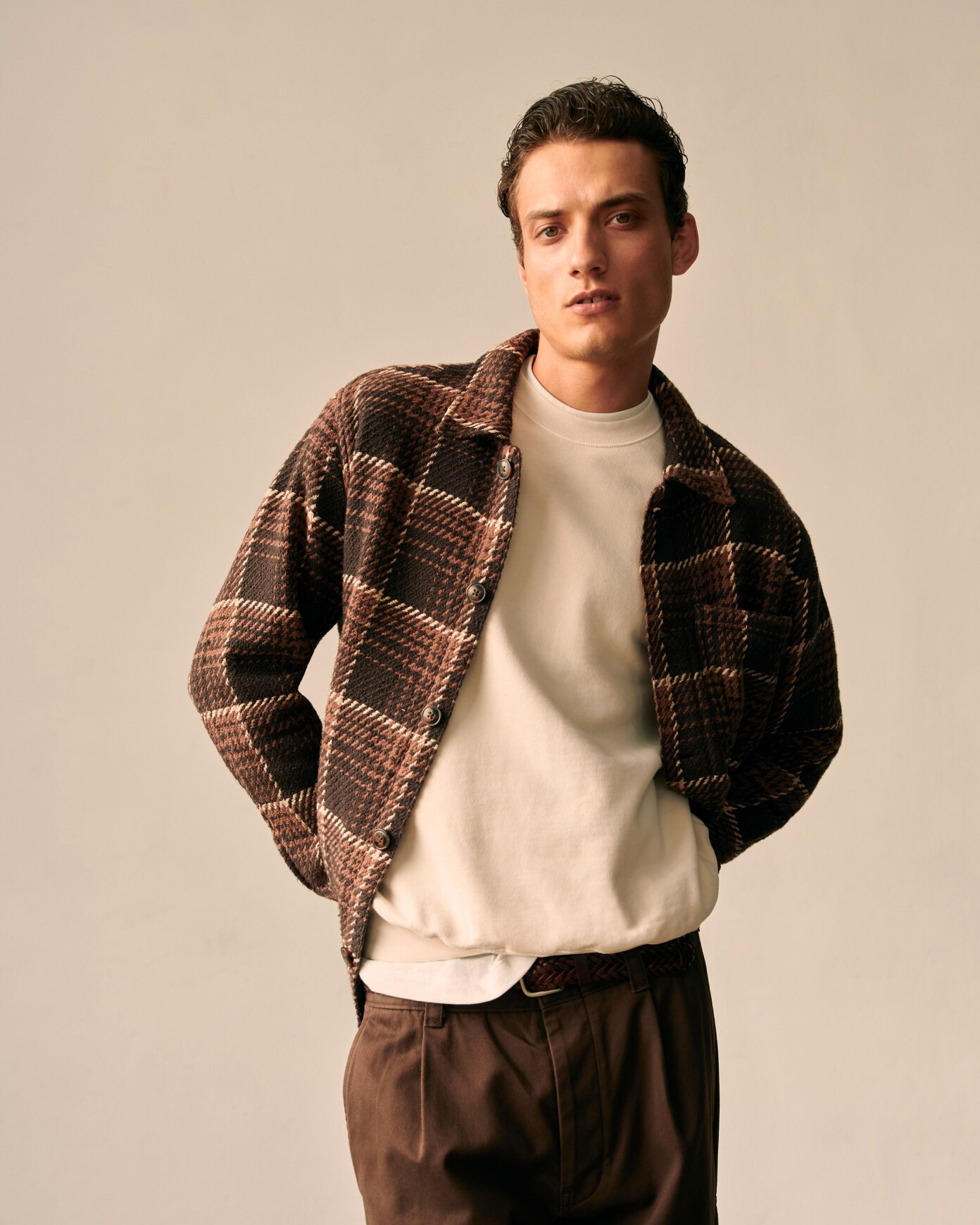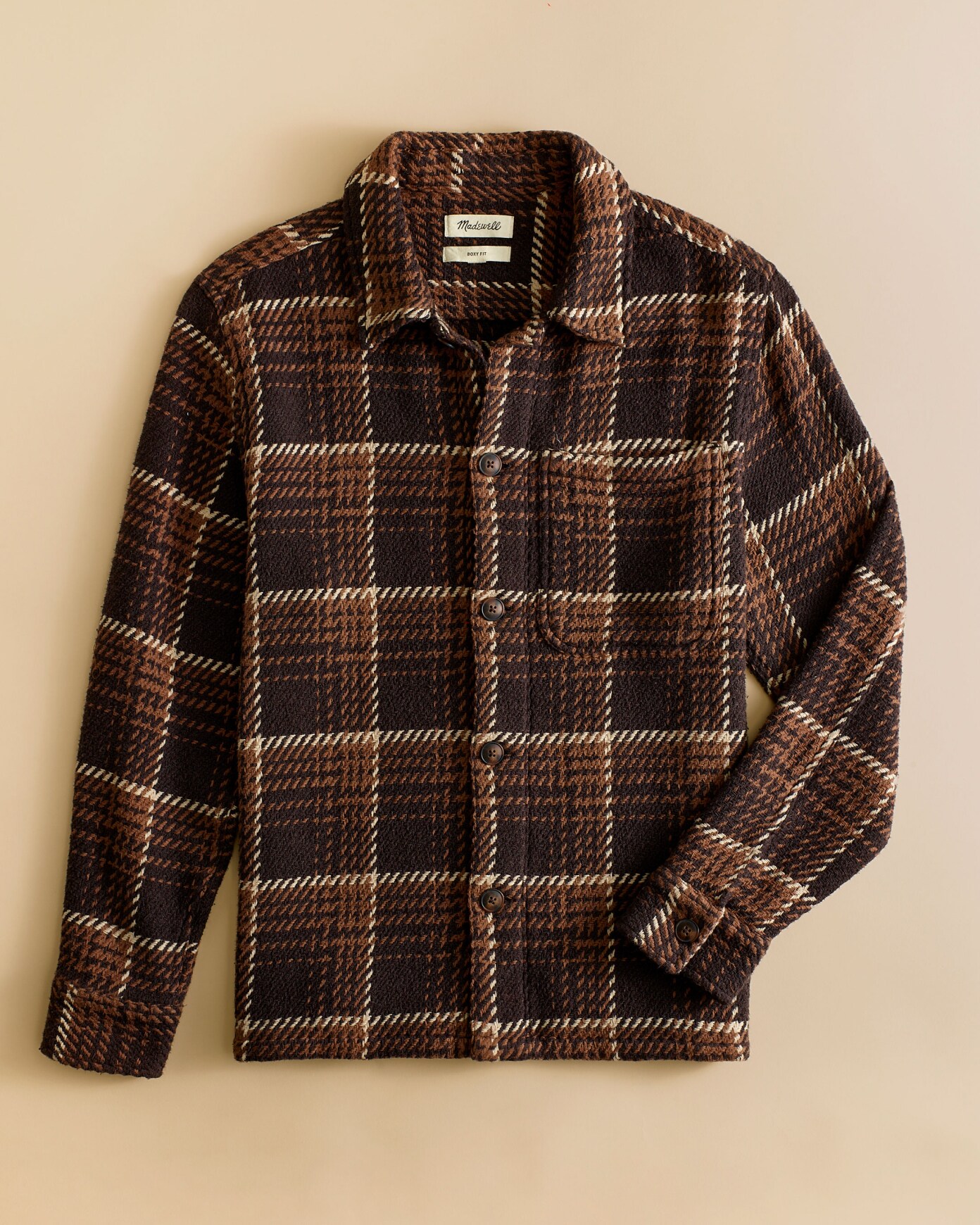 Woven in an abstract plaid design, this chunky cotton layer is made with our signature oversized fit, faux horn buttons and a classic patch pocket. Pair it with our Pleated Cargo Pants for an earth-toned look with its roots firmly planted in style.