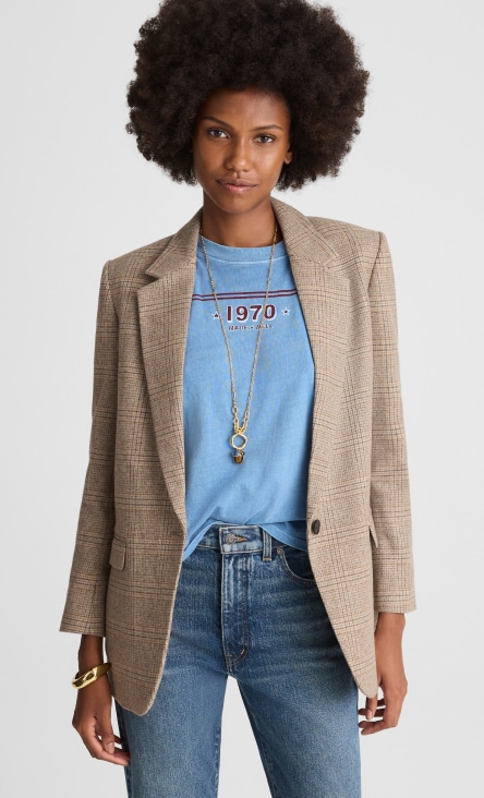Need some office-appropriate outfits? Check out Madewell's selection of women's blazers. Whether you need fresh looks for a brand-new job or are upgrading your current work wardrobe, a classic blazer in timeless colors like soft gray, midnight black or chestnut brown is always a safe bet. Or go for a patterned blazer in subtle cream and gray checks or a bold '70s-inspired plaid. Not feeling bold? Textured fabrics like corduroy, knit or Italian wool adds a level of depth and detail to a traditional blazer or other women's coats.