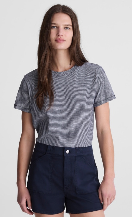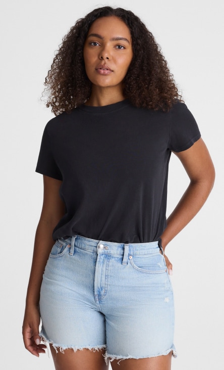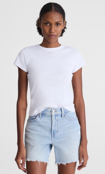 Want a curve-hugging fit? High-waisted shorts hit above the belly button for a snatched look (particularly if they have our signature Magic Pockets™ in front). Style your denim high-waisted shorts with a loose popover shirt or a Madewell activewear crop top for your next outdoor concert.