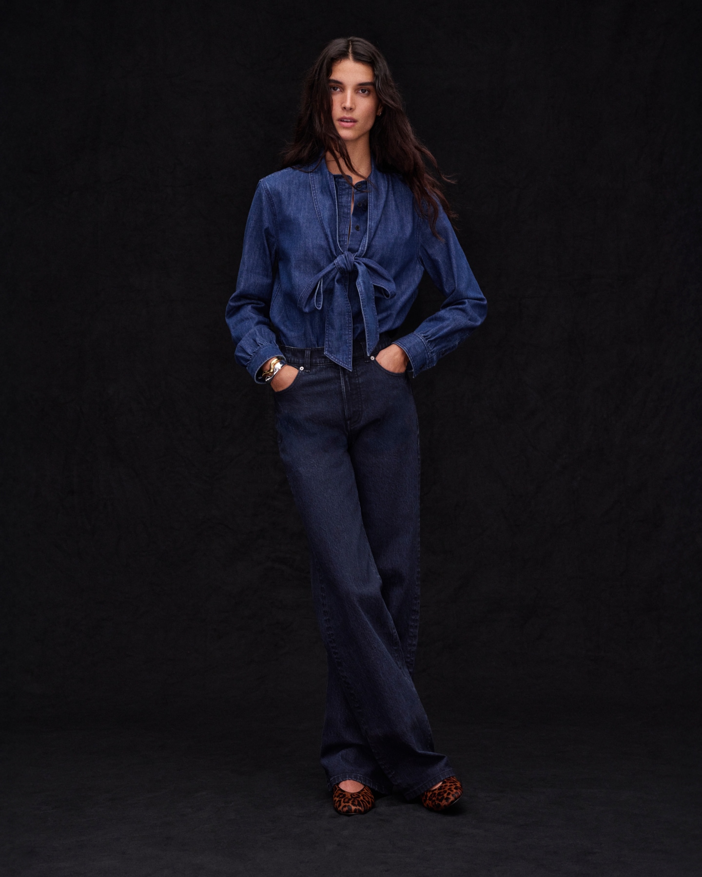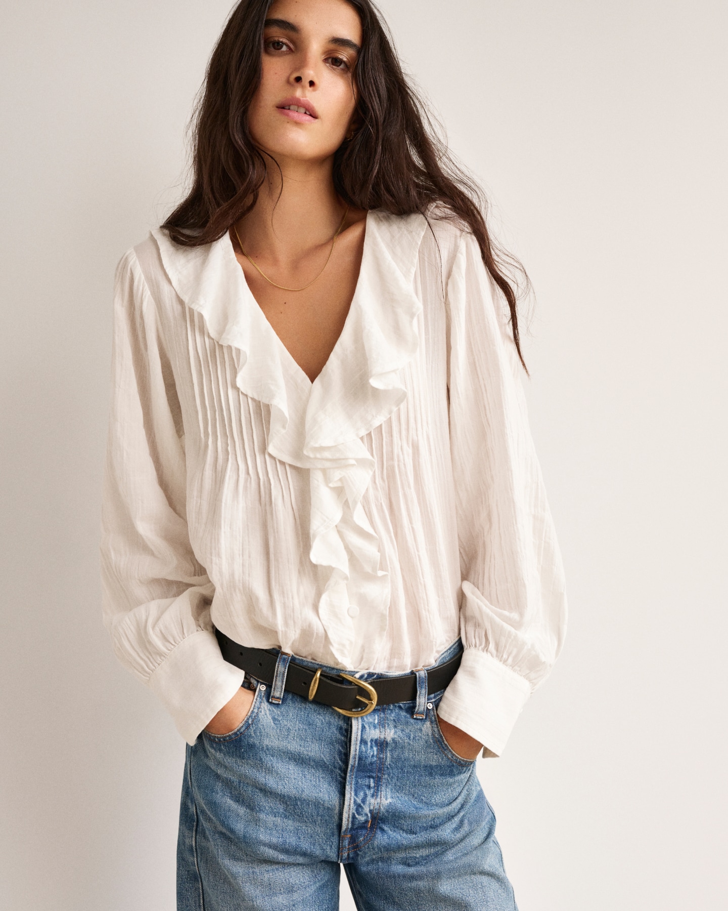 A cascading collar, textural pintucking—a romantic take on the everyday blouse.